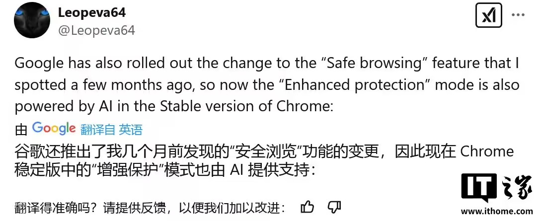 IT之家 2 月 17 日消息,消息源 @Leopeva64 昨日(2 月 16 日)在 X 平臺發(fā)布推文,稱在經(jīng)過 3 個月的 Canary 頻道測試后,谷歌 Chrome 瀏覽器穩(wěn)定版已全平臺上線全新“增強(qiáng)保護(hù)”(Enhanced protection)功能,在現(xiàn)有功能基礎(chǔ)上,通過 AI 實(shí)時(shí)防護(hù)危險(xiǎn)網(wǎng)站、下載和擴(kuò)展程序等。